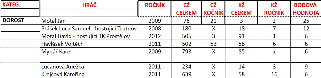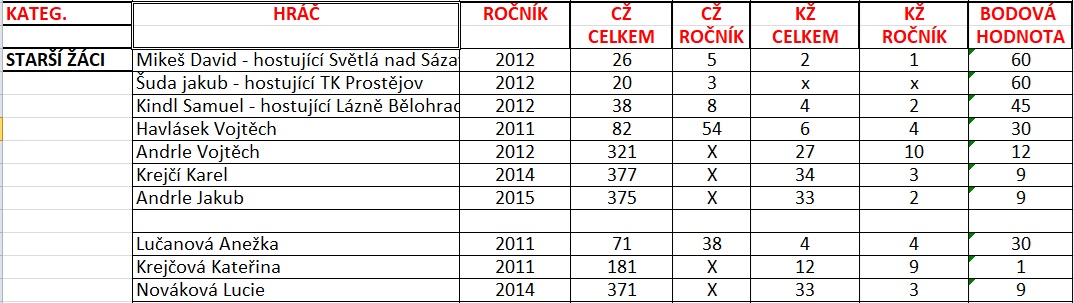 Nejlepšího umístění dosáhli ve starších žácích DAVID MOTAL (1. místo v ČR ročníku 2012, celkově se umístil na 10. místě) a v dorostencích DOMINIK VÁGNER (7. místo v ČR ročníku 2012, celkově se umístil na 27. místě), oba hráči ve svých věkových kategoriích hráli za TK Prostějov a v tabulce je najdete pouze v kategoriích, za které hráli mistráky u nás.