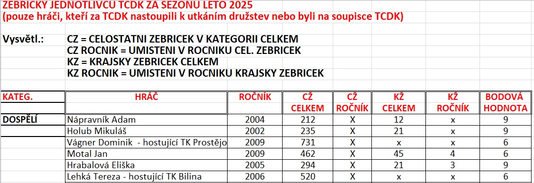Přinášíme přehled umístění hráčů tak, jak za TCDK nastoupili za jednotlivá družstva.