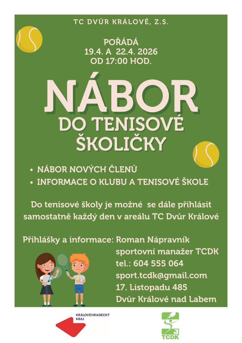 V případě Vašeho zájmu se můžete kdykoliv obrátit na šéftrenérku a vedoucí tenisové školičky paní Veroniku Vágnerovou, tel: 605 550 188 a můžete si s ní domluvit termín kdy si pár lekcí přijde Vaše dítě nezávazně vyzkoušet.